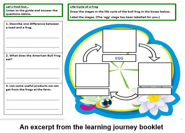 Before the learning journey, each of our students received a school-based learning booklet from their teachers. This learning booklet helps them to record their learning throughout their time at the frog farm. It contains questions on the life cycle of a frog as well as some reflection questions to be done during or after the learning journey. This booklet also helps them to consolidate their learning through note-taking and drawing of their observations. |